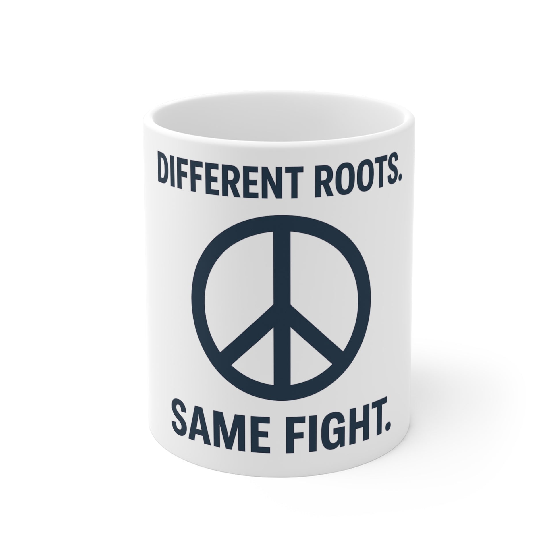 Start your day with a message of unity and peace with this stylish mug. Featuring the quote "Different Roots. Same Fight." alongside a classic peace symbol, this mug embodies a spirit of inclusivity and activism.